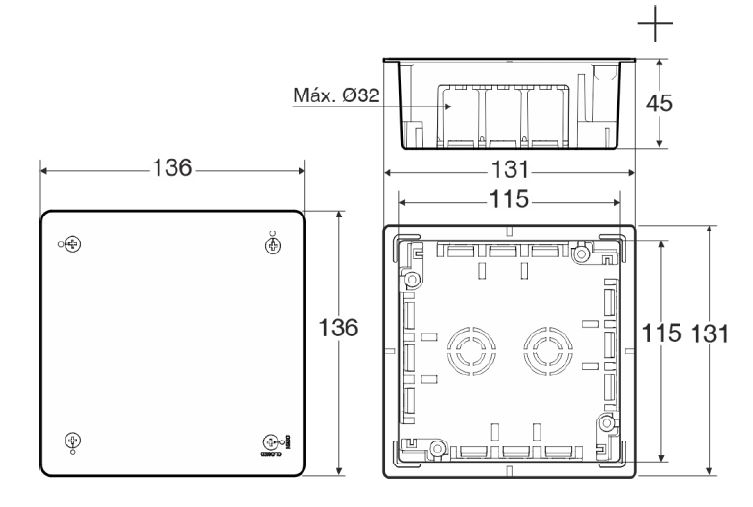 | Méret | kivágási méret: 115x115mm fedél méret:136x136mm mélység: 45mm kikönnyítés az oldalán: 12xO25mm kikönnyítés az alján: 2xO16/25mm |